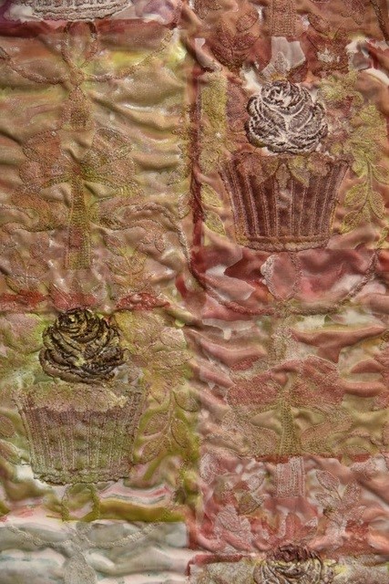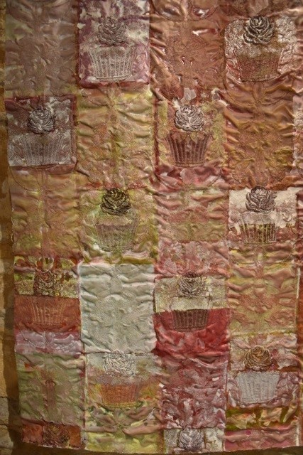 Dans un autre type d’œuvres qu’elle présente comme des livres de grand format qu’on aimerait feuilleter et qui pourraient être posés sur un lutrin, les feuillets sont placés les uns sur les autres, enveloppés dans un fragment d’étoffe. La conception optique du travail est ici soulignée par une écriture personnelle tracée , grattée, la toile semble repassée à la chaux puis réécrite, mais à demi effacée, presque illisible …on découvre quelques fragments de mots , néo palimpsestes?? les couleurs sont ici plus foncées, des bistres bordés de doré , des parchemins sur lesquels le temps a posé sa marque, a effacé les paroles (secrets? Symboles? non dit ? questionnement sur le temps qui passe? pérennité? Anti-pérennité?.) Talent, technique, passion…