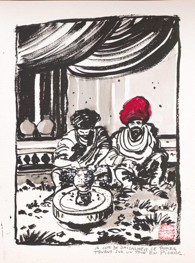De son style vigoureux, au trait rapide pour saisir les mouvements, il adore croquer des esquisses. Ses nombreux carnets de voyages à travers le monde lui servent de base pour recréer de grands dessins à l’encre, parfois rehaussés d’une touche de couleur. Formé aux Arts Décoratifs de Strasbourg puis aux Beaux- Arts de paris, il est aussi un céramiste reconnu, maître de stages, et l’on retrouve le même dynamisme dans ses sculptures ou dans les oiseaux et lapins bondissants qu’il trace avec vivacité sur sa magnifique vaisselle de terre vernissée.