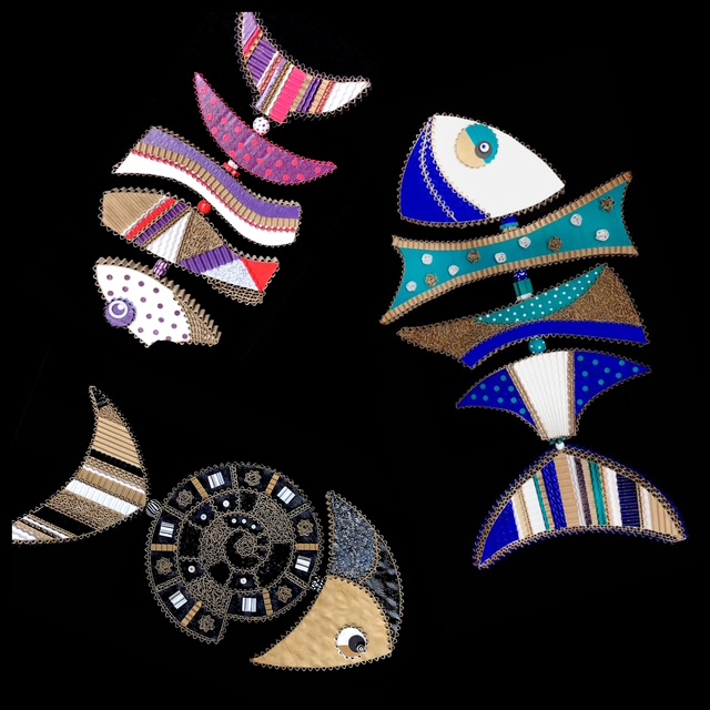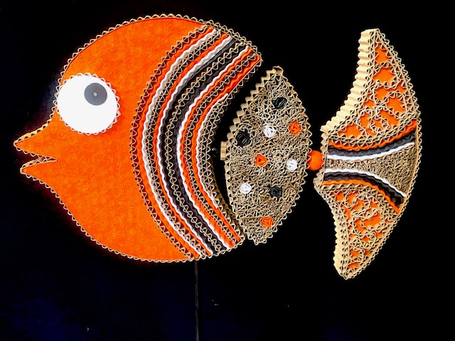 Autant ses bustes féminins sont dans une épure sensuelle, autant ses poissons explosent de couleurs, dans une joyeuse stylisation ! Sensibilisée à l’art de la récupération par ses nombreux séjours en Afrique, elle aime rendre sa noblesse à ce « matériau-déchet » aux multiples possibilités : « À plat, en mettant à nu la cannelure interne; en structure, en utilisant la technique du contrecollé, et dans l’épaisseur, en le découpant en bandes que j’aplatis, triture et presse pour former une dentelle. Ce bestiaire aquatique aux couleurs vives et chatoyantes et aux formes déstructurées répondait pour moi à un besoin d’évasion pendant la période sombre de la Covid… »
